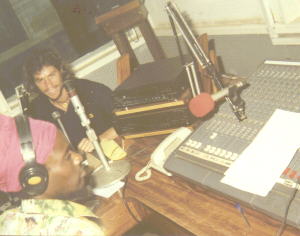 I arrived at the Biriwa Beach Hotel at about 9:00 pm. Vincent was supposed to get there by motorcycle before me, but of course there was no sign of him when I got in. The owner was forewarned of my arrival, so I was quickly in my room and back at the restaurant for a wonderfully fufu-free meal of barbecued lobster and rice. Failing to get through to the US by phone for the umpteenth time in the past 48 hours I hit the sack. It was a rough night... The air conditioner was set at low sauna, and I was starting to feel the effects of a case of bronchitis that I had been successfully holding off for several days. I decided to bail out on the morning workout, but nobody was inconvenienced, because Vincent had already "arranged it" off the schedule with another radio interview--this one a live 10-minute chat with the local reggae DJ. We seemed to hit it off right away, partly because I knew the lyrics to most of the songs he was playing, and partly because by that time my hair was in full dreadlock mode, having been without a decent shower for several days. The apartment at the Air Force Base in Accra only has one working spigot, that being in the kitchen. All other water uses are fulfilled by loading up a big bucket in the kitchen, carrying it where you need it, and dispensing it from there. So to shower, one goes into the shower stall with the big bucket and a smaller pail which is used to scoop water out of the bigger bucket. So a shower is really more of a standing sponge bath. Due to the problems associated with the rainy season, even the posh Biriwa Beach Hotel was without running water, so showers continued in the same manner in Cape Coast, hence my rapport with the Rastafarian DJ...