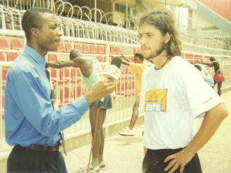 Since most of the attendees were press or administrators who had no idea what racewalking was, I showed some video footage of the 1997 World Cup. All were indeed impressed and surprised at the level of athleticism displayed by the walkers in the video (except, of course, when I flailed across the screen, struggling at the end of the race...) Next we went outside where I got the 10 or so racewalkers walking. It was very obvious that they all learned to walk from the same source. When I worked with Vincent last summer he walked very stiffly, trying to cover ground without bending his knees at any part of his stride. The stiff-legged technique was shared by every other walker except one. So making the changes was a very easy job. I got before and after shots on film and then had to beg to show the walkers the results, since we were already over our 12:00 cut-off time. They were all very impressed by the changes and vowed to make them stick. After the (short) clinic and several TV and press interviews, we headed to lunch for more fufu.