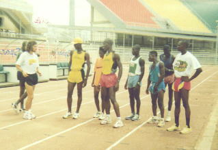 Since most of the attendees were press or administrators who had no idea what racewalking was, I showed some video footage of the 1997 World Cup. All were indeed impressed and surprised at the level of athleticism displayed by the walkers in the video (except, of course, when I flailed across the screen, struggling at the end of the race...) Next we went outside where I got the 10 or so racewalkers walking. It was very obvious that they all learned to walk from the same source. When I worked with Vincent last summer he walked very stiffly, trying to cover ground without bending his knees at any part of his stride. The stiff-legged technique was shared by every other walker except one. So making the changes was a very easy job. I got before and after shots on film and then had to beg to show the walkers the results, since we were already over our 12:00 cut-off time. They were all very impressed by the changes and vowed to make them stick. After the (short) clinic and several TV and press interviews, we headed to lunch for more fufu.